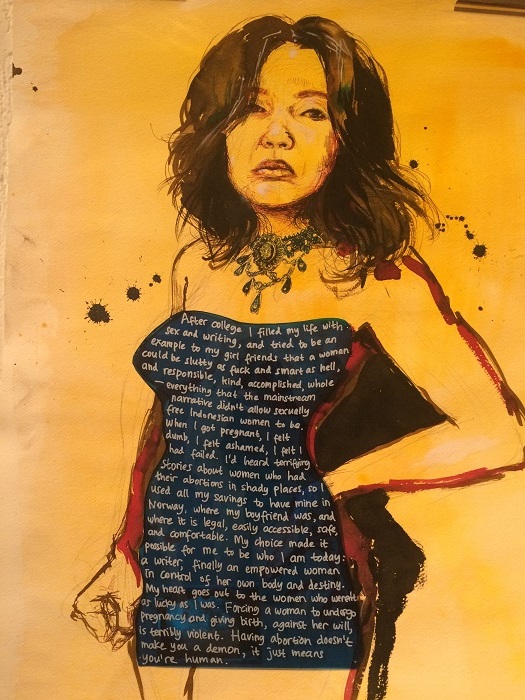 A painting by artist Molly Crabapple, from a series of paintings of American and Indonesian women who'd had abortions. Dress and words by Eliza Vitri Handayani / Jin Panji with permission